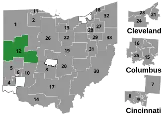 Ohio's 12th senatorial district has been based in rural western Ohio. It comprises the counties of Allen, Mercer, Shelby, Champaign as well as portions of Auglaize, Darke and Logan counties. It encompasses Ohio House districts 4, 84 and 85. It has a Cook PVI of R+29. Its Ohio Senator is Republican Susan Manchester.