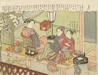 The highest rank of courtesan was that of tayū (太夫), followed by kōshi (格子).[15][16] Unlike courtesans of lower rank, tayū had sufficient prestige to refuse clients.[17] Their high status also made the services of tayū extremely pricey – a tayū's fee for one evening was between one ryo and one ryo, three bu, well beyond a laborer's monthly wage and comparable to a shop assistant's annual salary.[18]