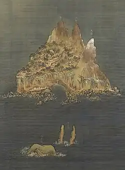 Japan's two oldest historical documents, the Kojiki and the Nihon Shoki, include references to Okinoshima.[3] The Kojiki states that the sun goddess Amaterasu created three daughters from a sword and sent them to Japan where they were worshiped by the Munakata clan.[6] The Munakata Taisha, a collection of three shrines in Munakata, is dedicated to the goddesses. Locals continue to worship them for protection across the sea. Likewise, the island itself is considered a deity.[1] The mainland has several Okinoshima worship sites as travel to the island is restricted.[7]