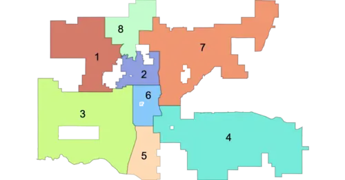 Ward map of Oklahoma City, effective 1 April 2022. | |