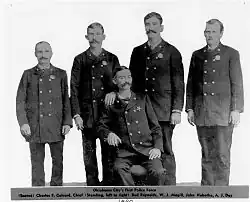 The Oklahoma City Police Department was officially formed following the Land Rush of 1889 in central Indian Territory.[4] The department began as a small collection of officers. The department's first Chief was Charles F. Colcord and municipal court was held in a small tent near California Avenue.[4] By the turn of the century, public drinking had caused many quality of life issues for the small community.[5] In 1907, Oklahoma voters approved a liquor prohibition.[6] A new City Charter was adopted early in March 1911. One of the Charter's provisions changed the office of the Chief of Police from elective to appointive. The charter also adopted a commissioner form of government.[4] In July 1911, Mayor Whit M. Grant named Bill Tilghman as police chief.[4] Tilghman had earned a reputation in the Western frontier having served as a U.S. Marshal, where tracked down outlaws like Bill Doolin.[4] Under Tilghman's leadership, the OCPD rigorously targeted gambling, bootlegging, and prostitution rings.[5]