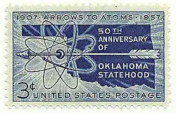 A single three-cent stamp was issued by the United States Post Office Department on June 14, 1957, to commemorate the 50th anniversary of Oklahoma's admission into the United States. The stamp's primary color is deep ultramarine and it has a graphic depicting an arrow piercing an atomic symbol.[1]