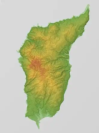 Okushiri Island is located roughly 20 kilometers (12 miles) west of mainland Hokkaido. It is oval in shape with a coastline of 84 kilometers (52.2 miles). The island spans 27 kilometers (16.8 miles) from north to south, and 11 kilometers (6.8 miles) from east to west. Mount Kamui is the island's highest peak, and reaches 584 meters (1,916 feet).