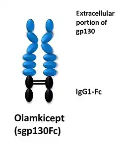Olamkicept, also known as soluble gp130Fc or sgp130Fc (other designations are FE 999301, FE301, TJ301) is an immunosuppressive drug candidate, which selectively blocks activities of the cytokine Interleukin-6, which are mediated by the soluble Interleukin-6.[1] Interleukin-6 is a cytokine, which plays a dominant role in the regulation of the immune response and also in autoimmunity. Furthermore, Interleukin-6 has been demonstrated to be involved in the regulation of metabolism and body weight.[2] Interleukin-6 also has many activities on neural cells.[3] The biochemical principle was invented by the German biochemist Stefan Rose-John and it was further developed into a biotech compound by the Conaris Research Institute AG, which gave an exclusive world-wide license to the Swiss-based biopharmaceutical company Ferring Pharmaceuticals.[4] In December 2016, Ferring and the biotech company I-MAB signed a licensing agreement granting I-MAB exclusive rights in Asia to Olamkicept for the treatment of autoimmune disease.[5]