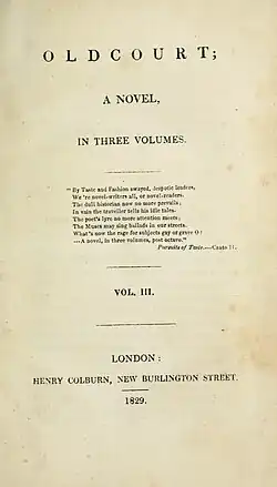 Oldcourt is an 1829 novel by the Irish writer Martin Archer Shee, originally published in three volumes.[1] Archer Shee is better known as a painter, and was the following year elected President of the Royal Academy in London, but he also published poetry, two novels and a play. It was published by Henry Colburn of New Burlington Street in London. It takes place around Oldcourt Castle, in Ireland, and depicts Roman Catholic characters at the time of Catholic Emancipation. It received a negative review in The Athenaeum magazine.[2] Archer Shee followed it with a second novel Cecil Hyde in 1834.