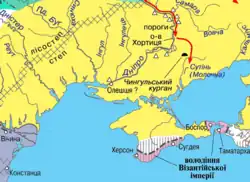 Oleshia[5] or Oleshye[a] is the name of a former settlement and a historic area on the lower Dnieper. During its existence, the port settlement was controlled by Kievan Rus', and was an important center of fishing and trade due to its location on the route from the Varangians to the Greeks.[5] In May 1223, the Rus' princes Danylo and Mstislav defeated the Mongols during Battle of Oleshia.[7]