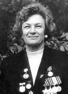 After the war she married, taking on her husband's surname. Despite her injuries from the war rendering her classified as a disabled veteran, she did not retire, participating in a long-term voyage of Soviet whalers to Antarctica and later becoming executive secretary of the Soviet Peace Committee. She died on 29 March 2002.[7][8]