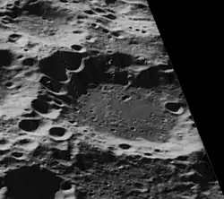 In comparison to the rim, the interior floor is nearly flat and smooth. The most notable impact is a small craterlet near the northern rim. There are a few tiny craterlets scattered about, but nothing of significance. The crater lacks a central peak, and the only irregularities lie along the edge of the inner wall.