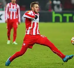 The 2016–17 season proved to be rather tumultuous for the club, despite the signing of such key players as Óscar Cardozo, Tarik Elyounoussi, Alaixys Romao, Aly Cissokho and Marko Marin.[100] The main issues that arose were the team's shock elimination from Israeli outfit Hapoel Be'er-Sheva, after a 1–0 aggregate defeat, in the third qualifying round of the UEFA Champions League, and the highly frequent change of managers, leading the club to having been coached by five individuals over the same season: Marco Silva, Victor Sánchez (responsible for the elimination from Hapoel), Paulo Bento, Vasilis Vouzas and Takis Lemonis. The team's UEFA Europa League journey was not as successful as other European campaigns, starting with a difficult 3–1 aggregate victory (1–1 before extra time) over Arouca in the playoffs, continuing with the team's qualification from the group stage but only as second-placed to APOEL (in a group that also included Young Boys and Astana), and ending with a heavy 5–2 aggregate defeat to Besiktas in the last 16 of the knockout stage (with goalkeeper Nicola Leali being highly responsible for 4 out of the 5 goals conceded[101]), despite having advanced from the last 32 thanks to a 3–0 aggregate win over Osmanlispor. The frequent manager change negatively affected the team's stability and rhythm in domestic competitions as well. Firstly, Olympiacos failed to qualify for the Greek Cup final after being ousted by AEK, who advanced on the away goals rule after a 2–2 aggregate draw. Secondly, despite the fact that the Reds clinched their 44th Greek Championship, and 7th consecutive for the second time in Greek football history, they only managed to do so with a six-point difference (67 to 61) over PAOK.