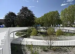 The village was designed with the climatic conditions of 2050 in mind. Extensive gardens covered 40 percent of the area, with 9,000 trees and shrubs planted, and there was a six-hectare park. A treatment system recovered waste water for irrigation and cooling.[35][36] The design of the buildings allowed for air circulation through natural summer ventilation.[37] The village layout had long, straight gaps between buildings that led down to the Seine, allowing cool air from the river to travel inland. Five huge outdoor air filters developed by the French company Aérophile removed 95% of particulate matter from the air, filtering 30 m3 of air per second while using very little electricity.[38][39] In addition, 1,500 housing units were equipped with Teqoya VMC (controlled mechanical ventilation) systems that can capture 90% of microparticles, bacteria, pollens and allergens.[40][41][42]