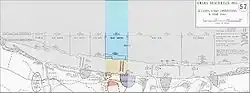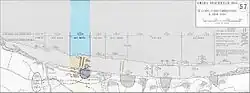 The German defensive preparations and the lack of any defense in depth indicated that their plan was to stop the invasion at the beaches.[5] Four lines of obstacles were constructed in the intertidal zone. The first, a non-contiguous line with a small gap in the middle of Dog White and a larger gap across the whole of Easy Red, was 250 m (270 yd) out from the highwater line and consisted of 200 Belgian Gates with mines lashed to the uprights. 30 meters (33 yd) behind these was a continuous line of logs driven into the sand pointing seaward, every third one capped with an anti-tank mine. Another 30 meters (33 yd) shoreward of this line was a continuous line of 450 ramps sloping towards the shore, also with mines attached and designed to force flat-bottomed landing craft to ride up and either flip or detonate the mine. The final line of obstacles was a continuous line of hedgehogs 150 meters (160 yd) from the shoreline. The area between the shingle bank and the bluffs was both wired and mined, and mines were also scattered on the bluff slopes.[6][7]