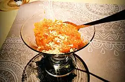 Omani cuisine is part of the Khaleeji cuisine and is influenced by Arab, Pakistani cuisine, Iranian, Indian, Asian, Eastern Mediterranean, and African cuisine,[1] reflecting Oman's position as a vast trading empire at the intersection of traditional spice trade routes.[2] Dishes are often based on chicken, fish, and lamb, as well as the staple of rice. Most Omani dishes tend to contain a rich mixture of spices, herbs, and marinades.[3] Omani cuisine differs from other cuisines in the Arabian peninsula, as it is less spicy and rarely served warm.