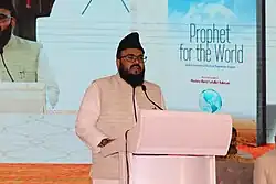 ![]() Omar Abedeen Qasmi, announcing at the launch ceremony of his father Khalid Saifullah Rahmani's book Prophet for the World, on 14 September 2024.[1][2] | |