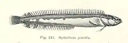 Ophiclinus gracilis, the Black-back snake-blenny, is a species of clinid native to the coastal waters of southern Australia where it prefers areas with rotting vegetation on silty substrates. It can reach a maximum length of 10 centimetres (3.9 in) TL.[2]