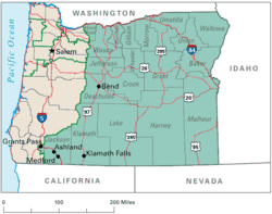 The district covers roughly two-thirds of the state, east of the Willamette Valley. It includes all of Baker, Crook, Gilliam, Grant, Harney, Hood River, Jackson, Josephine, Klamath, Lake, Malheur, Morrow, Sherman, Umatilla, Union, Wallowa, Wasco, Wheeler counties, all but a small sliver of Jefferson County, the southeastern portions of Deschutes and Douglas counties, and small, unincorporated portions of Clackamas and Marion counties.[3]