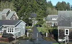 The University of Oregon first established OIMB as a summer research and education program in 1924, operating out of tents along the beach of Sunset Bay. OIMB settled into its current location in 1931, when 100 acres of the Coos Head Military Reserve, including several buildings from the Army Corps of Engineers, was deeded to the University of Oregon. In 1937, OIMB was transferred to Oregon State College (now Oregon State University), and remained theirs until the federal government required the property during World War II. Following the war, OIMB was initially returned to Oregon State University, but the University of Oregon reclaimed it in 1955 as a summer research facility.[1] Since 1966, OIMB has been expanding its educational programs and its campus, constructing more teaching and research facilities and developing year-round educational programs. Notably, the Loyd and Dorothy Rippey Library was built in 1999, and construction of the Charleston Marine Life Center began in 2012.[1][4] The CMLC is entirely powered by a wind turbine that was erected in 2014. OIMB has functioned as a year-round research facility since 1966, and courses were developed for fall, spring, and summer soon after.[1] Winter classes became available beginning in 2017.[5]