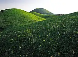 Yongnuni Oreum is 247.8 m (813 ft) tall oreum in Gujwa, Jeju City. It is likely named for, and is said to resemble a Chinese dragon lying down.[7] The oreum is considered beautiful, with scenic views of the east coast of Jeju, including of the mountain Seongsan Ilchulbong and the island Udo. Its gentle incline makes it a popular hiking destination for families.[8][9][10]