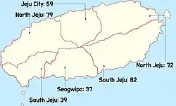 - North part of Jeju (북제주군) : 151 (Hallim-eup 16, Aewol-eup 50, Gujwa-eup 40, Jocheon-eup 30, Hangyeong-myeon 13, Udo-myeon 2)