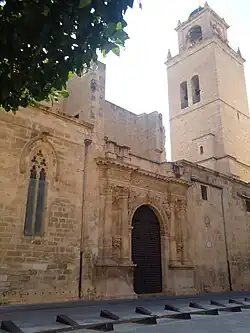 Construction was begun in the late 13th century in Valencian Gothic style, with a Latin cross plan including a nave and two aisles, an ambulatory and chapels within buttresses. The crossing, the late-Gothic great chapel, and the ambulatory are 15th century-early 16th century additions, including the removal of two pillars of the nave to obtain a taller vault at the crossing, after a design by Pere Compte.