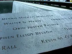 {{cite web}}: CS1 maint: multiple names: authors list (link) - ^ "South Pool: Panel S-17 - Orio Joseph Palmer". National September 11 Memorial & Museum. Archived from the original on July 27, 2013. Retrieved October 29, 2011.