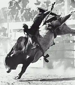 Finally, in 1975, John Davis succeeded in being the first bull rider to ride Oscar and win the bronze statue.[3] Davis conquered Oscar in July 1975 at the California Rodeo Salinas. Davis also won the championship gold buckle that day.[5] Also in 1975, Randy Mager obtained one of his two rides from Oscar at the National Finals Rodeo when he finished as the Reserve World Champion.[6] Even after these rides, Oscar still was ridden very infrequently.[2]