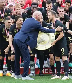 Gloukh (crouching on the far left) celebrating the 2022–23 Austrian Bundesliga championship with Red Bull Salzburg