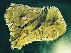At 9.73 square kilometers (3.76 sq mi), Ōshima is the largest uninhabited island under Japanese sovereignty. The island is a double caldera with a scoria hill rising in the middle. It is the peak of two overlapping stratovolcanoes and their associated calderas, Mount Higashi and Mount Nishi.[1] The highest peak, Mount Era (江良岳, Era-dake) at 737 meters (2,418 ft),[2] is part of a triple volcano. The peak rises close to 2,000 meters (6,600 ft) from the sea floor. The island consists of mafic alkali and non-alkali volcanic rock, less than 18,000 years old.[3] On the south side of the island at Aidomari (北風泊, Aidomari), there is a lighthouse and a heliport operated by Japan Coast Guard.