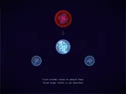 The aim of the game is to propel oneself, a single-celled organism ("Mote"), into other smaller motes to absorb them. Colliding with a mote larger than the player will cause the player to be absorbed, resulting in a game over. Motes smaller than the player are blue, while motes bigger than the player are red. Changing course is done by expelling mass. Due to conservation of momentum, this results in the player's mote moving away from the expelled mass, but also in one's own mote shrinking.