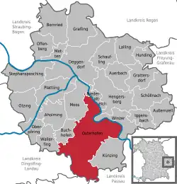 Osterhofen (German pronunciation: [oːstɐˈhoːfn̩] ⓘ) is a town in the district of Deggendorf, in Bavaria, Germany. It is situated on the right bank of the Danube, 16 km south of Deggendorf.
