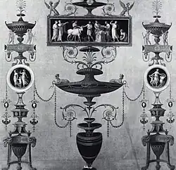 Adam's neoclassical interiors are among his most notable sequences of rooms. Horace Walpole described the drawing room as "worthy of Eve before the fall".[7] The rooms are characterised by elaborate but restrained plasterwork, rich, highly varied colour schemes, and a degree of coordination between decor and furnishings unusual in English neoclassical interiors. Notable rooms include the entrance hall, which has large semi-circular alcoves at each end, and the Etruscan dressing room, which Adam said was inspired by the "Etruscan" vases (as they were then regarded, now recognised as Greek) in Sir William Hamilton's collection, illustrations of which had recently been published. Adam also designed some of the furniture, including the opulent domed state bed, which is still in the house.