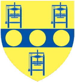 On either side a shire horse Azure each resting the interior hoof on a roundel Or.