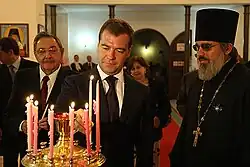 Raúl Castro, Dmitry Medvedev and Archpriest Vladimir Klyuyev of the Kazan Cathedral in Havana