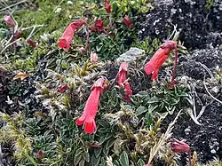 Ourisia chamaedrifolia is one of five species of Ourisia in the Tropical Andes, together with O. muscosa, O. pulchella, O. biflora, and O. cotapatensis.[8] All five species are in the herbaceous subgenus Ourisia.[4] Of these, O. chamaedrifolia is distinctive in its long, red or orange-red, glabrous, tubular corollas.[8] Although the pollination biology of O. chamaedrifolia has not been studied, the colour, shape and vertical orientation of its corollas suggests hummingbird pollination.[9]