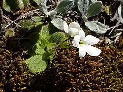 Ourisia simpsonii is morphologically similar to other New Zealand small-leaved species, namely O. sessilifolia, with which it shares the subrosette or rosette habit, ovate to very broadly ovate or obovate to very broadly obovate leaves, irregular white corollas, and having a mixture of glandular and non-glandular hairs on many plant parts.[1][5]