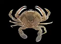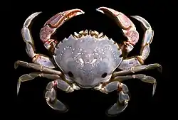 - ^ This group – one of two – is distinguished from the rest of Ovalipes by features such as iridescence, lack of a tooth at the top of its orbit, and a carina ending in a spine on the outer wrist.[13]