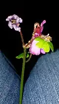 Oxalis brasiliensis is a herbaceous, perennial plant with a very long but simple root and very small stems.[3] It has yellow[3] or brilliant crimson-purple[4] flowers.