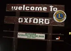 Oxford (Māori: Tawera)[4] is a small town serving the farming community of North Canterbury, New Zealand. It is part of the Waimakariri District and is a linear town, approximately 2 kilometres (1.2 mi) long. Oxford has won awards for the most beautiful village and the most beautiful toilet.[5]