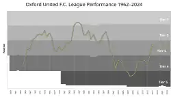 The club joined the Football League in 1962 after winning the Southern Football League, reaching the Second Division in 1968.[2] After relegation in 1976, between 1984 and 1986 the club earned successive promotions into the First Division, and won the League Cup in 1986.[3] However, Oxford were unable thereby to enter the 1987 UEFA Cup because of the UEFA ban on English clubs in European competitions.[4] Relegation from the top flight in 1988 began an 18-year decline which saw the club relegated to the Conference in 2006, becoming the first winners of a major trophy to be relegated from the Football League. After four seasons, Oxford returned to League Two in 2010 via the play-offs, and six seasons later achieved promotion to League One, after finishing second in League Two in 2016. In 2024 they were promoted to the EFL Championship via the play-offs.[5]