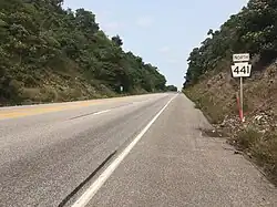 PA 441 continues past industry to the east of the Northwest Lancaster County River Trail, the railroad tracks, and the river before it reaches an interchange with the US 30 freeway, at which point it turns north. Past this interchange, PA 441 crosses into West Hempfield Township and becomes Chickies Hill Road, a three-lane undivided road with two northbound lanes and one southbound lane. The route runs north through forested areas and then a mix of homes and fields as it ascends a hill. The road narrows to two lanes and heads into forests as it passes to the east of Chickies Rock County Park, curving to the northwest.[2][3]