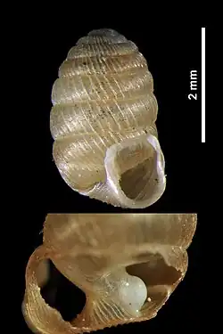 The shells of this snail species are minute, about 3 mm in height, barrel-shaped or skep-shaped, with a flared and somewhat ear-shaped aperture.