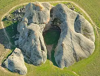 Painted Rock is a smooth horseshoe-shaped marine sandstone rock formation with pictograph rock art about 250 feet across and 45 feet tall near Soda Lake within the Carrizo Plain National Monument[1] on the southwest side of the northern Carrizo Plain, west of Bakersfield and about 70 miles (110 km) east of San Luis Obispo and 45 miles (72 km) west of Taft, in California, United States.