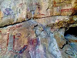 The interior of the rock alcove is adorned with many pictographs created by the Chumash, Salinan and Yokuts peoples over many thousands of years. In recent times there have been many marks left by early White settlers such as one reading "Geo. Lewis 1908", founder of Atascadero, California. Unfortunately there has also been major defacing of this site; in the 1920s the large pictogram was irreparably damaged by a shotgun blast.