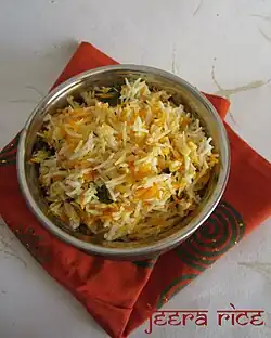 Zeera rice Steamed rice, Zeera (cumin), Zeera powder, ginger-garlic paste, salt, oil, chana dal and red chillies.