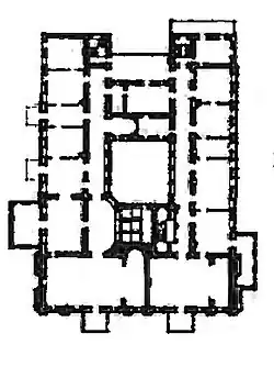 The palace plan and architectural solution differs by industrialist tones: enfilade of the rooms are completed with hall chambers, the windows are facing the front facade. All rooms, including "Black" stairs and toilets, are lit up when air does. The exact system of capital walls is represented by one layered construction and constitutes basis of the carcass, which is connected to extensive corridors. The main stairs cover the north-western part of the quadratic yard area. At the end, the service (black) stairs are located. The left portico has access to the corridor. A three-quarter turn, triumphant marble staircase rises up from the right to the second floor, and discloses an interior. From the entrance, there is a marble two-quarter turn, an indoor-looking corner staircase. Both stairs combine the corridor in the style of enfilade.[5] Palace of De Boure is considered one of the best objects in Baku with its architectural-plan and effectiveness.[8]