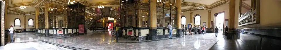 Inside, the marble floors and shelves combine with bronze and iron window frames manufactured in Florence, Italy.[3] The main stairway is characterized by two separate ramps that come together to form a landing. They also seem to cross on the second landing above, after which each move off in their own direction.[5] The meeting room contains frescos by Bartolomé Gallotti painted over a base of 24 carat gold, with themes relating to the history of written communication and the sending of messages.[3]