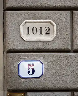 Next to the current house number is a marble plaque with the Napoleonic numbering, which identifies it as 1012: it is one of the few still visible in the city, and the fact that it is engraved in a marble plaque, rather than painted on the door, was typical of the most aristocratic residences.[2]