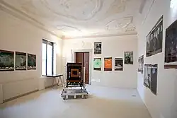 The second noble floor, intended for future artist workshops, preserves six monochromatic frescoes depicting Roman capricci solely in the central hall.