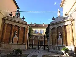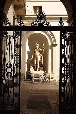 The original 16th-century palace was accessed through the entrance at Via Malaspina, and was refurbished by the Marquis Luigi Malaspina di Sannazaro (1754-1835). The iron gate is flanked by two converging screens with an eclectic array of decoration. On each side, two columns each flank a marble bust. From the street, the screen on the right has a bust of Boethius, the one on the left depicts Petrarch.[1] One representing the rational enterprise, the other the poetic enterprise. The allegorical figures atop reinforce these themes. Beyond the elegantly decorated iron gate is the main entrance through a portico of five arches, it leads to a grand staircase. The piano nobile has various frescoed and stuccoed rooms.[2]