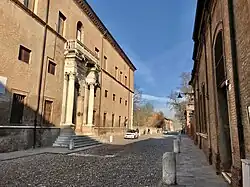Palazzo Prosperi-Sacrati is a Renaissance-style palace located on Corso Ercole I d'Este in Ferrara, region of Emilia Romagna, Italy. The palace with its protruding marble portal and balcony, and with a corner balcony and pilaster on the corner with Corso Biagio Rossetti, was designed and built in 1493-1498 by Biagio Rossetti as part of the Addizione Erculea.[1] It is flanked on the ground floor by marble pilasters. It is across the Corso Rossetti from the lateral facade of the Palazzo dei Diamanti.