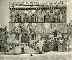 The facade facing the square has a fan-shaped stairway built in 1902 to replace the two-flight staircase dating from the 17th century. The original one is presumed to have been fan-shaped.[3] The trefoil Gothic portal is flanked by two triforas, the same as the five above, which have a pinnacle on top. The two on the right were added during the subsequent extension. On the ground floor, there are three asymmetrical arches; between the first two is a pulpit used for the reading of the edicts. Two large corbels above the Gothic portal support copies of bronze statues of the griffin, symbol of the city, and the Guelph lion; the originals (now in the entrance hall of the palace) were made in 1274,[4] probably for a vanished fountain by Arnolfo di Cambio. The chains hanging from the statue and the iron bar are those taken from the gates of Torrita di Siena by Perugian soldiers during the Battle of Torrita in 1358.[2]
